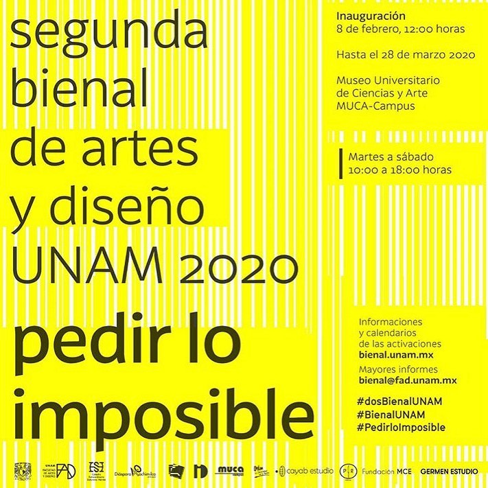 El 8 de febrero 2020 será inaugurada la exposición de la Segunda Bienal de Arte y Diseño UNAM 2020: Pedir lo imposible, en el MUCA-CU, a las 12:00 del mediodía.